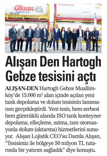 Alışan Den Hartogh Gebze Muallimköy’de 15.000 metre kare alan içinde açılan yeni tank depolama ve dolum tesisinin lansmanını gerçekleştirdi. Yeni tesis, hem serbest hem gümrüklü alanda ISO tank konteyner depolama, elleçleme, ısıtma, tam otomasyonla dolum (aktarma) hizmetlerini sunuyor. Alışan Lojistik CEO’su Damla ALIŞAN, “Tesisimiz ile bölgeye 50 milyon ₺ tutarında bir yatırım sağladık” diye konuştu.